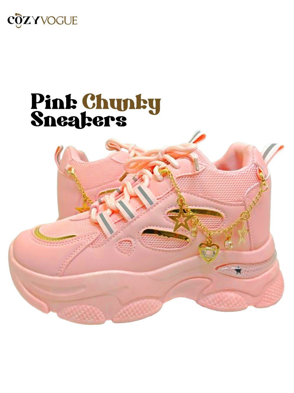 Our Pink Chunky Sneakers bring comfort and style together. With soft pastel color, golden chain, and a trendy chunky sole, these shoes are made for everyday wear. Light, comfy, and stylish – perfect for your daily look. CozyVogue – Because You Deserve Better